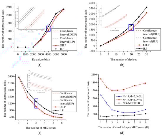 Comparison of the integer linear programming (ILP) algorithm and the OILP algorithm on the number of unprocessed tasks. (a) The relationship between the number of unprocessed tasks and the data size of the task; (b) the relationship between the number of unprocessed tasks and the number of the local devices; (c) the relationship between the number of unprocessed tasks and the number of MEC servers; (d) the relationship between the number of unprocessed tasks and the number of wired speed limit links of each MEC server.