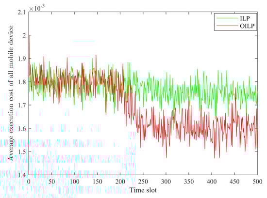 When the number of the local device and the number of the MEC server , the consumption of all local devices in each time slot was averaged for statistics. As shown in Figure 4, because the OILP algorithm in this paper can reduce the number of unprocessed tasks, the average time delay consumption will also be optimized, especially after the power of the system is stable (after about the 300th time slot), and the optimization effect is particularly obvious.