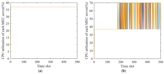 The CPU usage of each MEC server in each time slot. (a) the CPU resource utilization of the MEC server by ILP algorithm; (b) the CPU resource utilization of the MEC server by OILP algorithm.