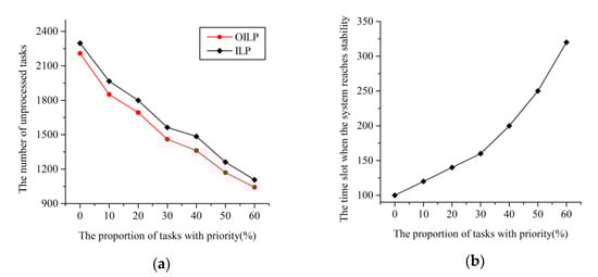The impact of the proportion of tasks with priority on the system. (a) The relationship between the number of unprocessed tasks and the proportion of tasks with priority ; (b) the relationship between the time slot when the system reaches stability and the proportion of tasks with priority ().