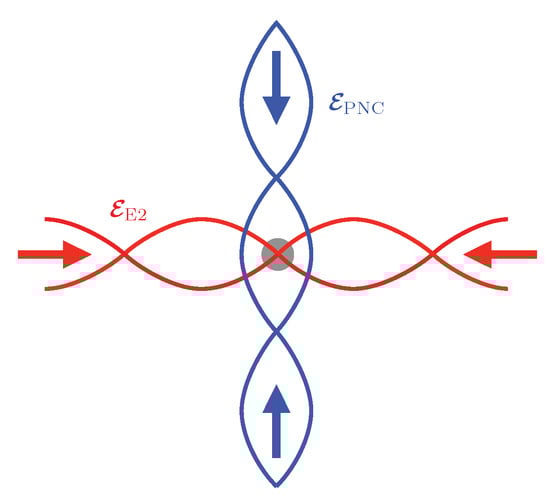 As in Figure 1, the setup generated by Equations (5) and (6) gives us two orthogonal standing waves, one driving an E2-transition and the other one inducing a PNC light shift. The difference is that, instead of limiting the field of view to one point in space, we look at the entire plane spanned by the two beams. This will have a periodic pattern of points fulfilling the detection requirements (E2 nodal point overlapping a PNC anti-nodal point).