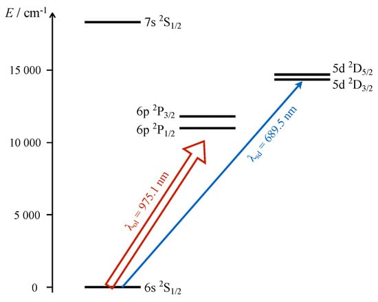 The ground state electronic configuration of neutral Cs is (see Figure 2). The configurations of low-lying excited states differ only with respect to the valence orbital being replaced by another one. Atomic wave functions of these states can be conveniently determined by considering the closed-shell electronic configuration first, and then appending the respective valence orbital. We consider the Dirac–Hartree–Fock (DHF) method as a path to obtain the mean-field wave function () of the configuration. The DHF wave function of the relevant atomic states of Cs atoms are then defined by with representing the respective appended valence orbital v.