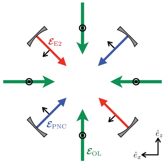 Proposed light field configurations. The red and blue arrows represent cavity enhanced standings waves, aligned at with the and axes. These excite respectively E2 and parity non-conservation (PNC) transition amplitudes (see Equation (2) and Figure 2). They have mutually orthogonal linear polarisations, and are resonant with the 6s–5d transition. The green arrows show optical lattice beams, linearly polarised along .