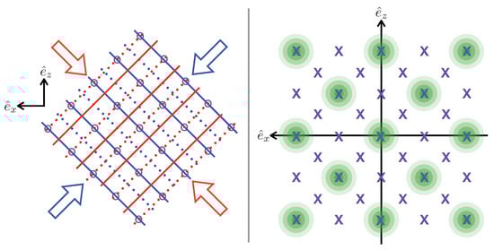 The optical lattice will ensure that every atom in the sample is tightly confined in the 2D-plane around a valid detection point. The configuration in Equation (4) yields a square optical lattice with the light shift potential [,,]: