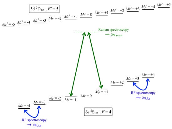 Detailed energy level scheme of the spectral line – including all involved Zeeman levels (). The degeneracy is broken, as shown in Equation (9). Our spectroscopic detection scheme is illustrated by the arrows. The blue ones correspond to radio-frequency (RF)-spectroscopy of the two level splittings and , and the par of green arrows the Raman spectroscopy of .