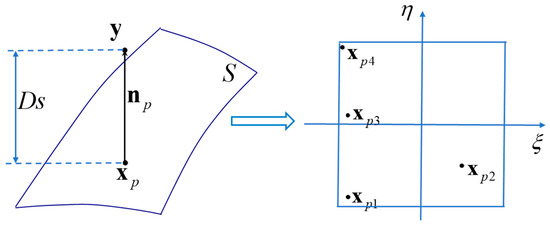In Equation (11), the integral regarding the variable of seems to be regular if the order of the singularity is lower than 2. It has been observed that the integral regarding the variable may be also nearly singular in the case that the nearest point xp is located very closely to the boundary of the integral patch. To further eliminate this near-singularity, we introduce a sigmoidal transformation for that the variable .