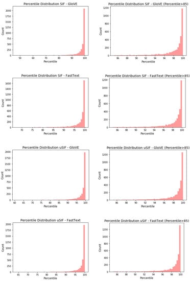 The percentile of every query or test caption in the validation set is noted for different models. As can be seen from Table 3 itself, for each of the embedding models, in approximately 99% of the cases, the relevant search results are within the Top-15%. Thus, to visualize these results, we further clip the percentile level to be greater than 85, as shown in the plots at the right-hand side in the figure below. The histograms are made using the stored percentiles, which are represented in Figure 5.