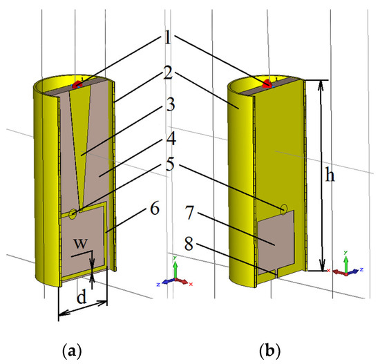 The improved near-field magnetic probe model geometry developed in the CST Studio Suite software for estimation of near-field EM distribution is presented in the Figure 1. The RF power is connected to the probe input 50 Ω port 1. The probe is encapsulated in the copper cylinder 2 with internal diameter of 8 mm for improved focusing of the MF. The probe is produced using the microstrip technology on the FR-4 laminate 4. The tapered line 3 is used for the improvement of the broadband matching of the magnetic loop 6 which is shaped as a rectangular trace loop on the top layer of the probe PCB with parameters d = 5.3 mm and w = 0.3 mm. The loop feed is provided through the PCB via 5 to the ground polygon of the bottom layer (Figure 1b).