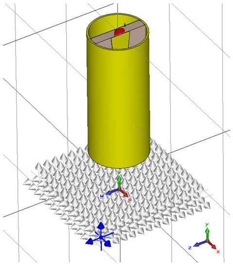 The near-field probe model is presented in Figure 2. The criteria of 30 grid elements per minimal wavelength was set while generating the mesh grid for the 3D (three-dimensional) model time domain solver in the CST Studio Suite. The cell dimension range was from 0.0175 mm to 3.29 mm; total number of 3,143,448 adaptive hexahedral mesh elements was generated in the solver for simulation. The EM field calculation results in the model by default are acquired in the 3D field monitors as a color map at a chosen frequency. For numerical data exporting purposes, the grid consisting of 169 isotropic EM field virtual probes in the proximity of the magnetic near-field probe were displaced in the XZ plane of the model (see Figure 2). The virtual probe grid density is 1 mm. A 101 × 2 element length array of absolute MF strength values versus frequency (80–3000 MHz range) is exported to the data file. The distance from the probe grid plane in the model was set in the range from 3 mm to 15 mm to cover the most probable range of distances for pre-scanning purposes.
