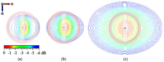 Near-field magnetic probe relative MF strength −6 dB apertures in the CST Studio Suite: (a) 3 mm distance, (b) 5mm distance, (c) 10mm distance.