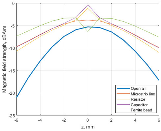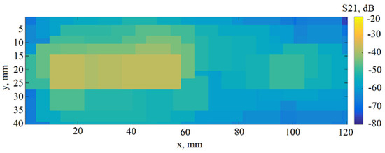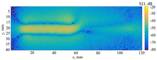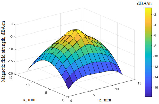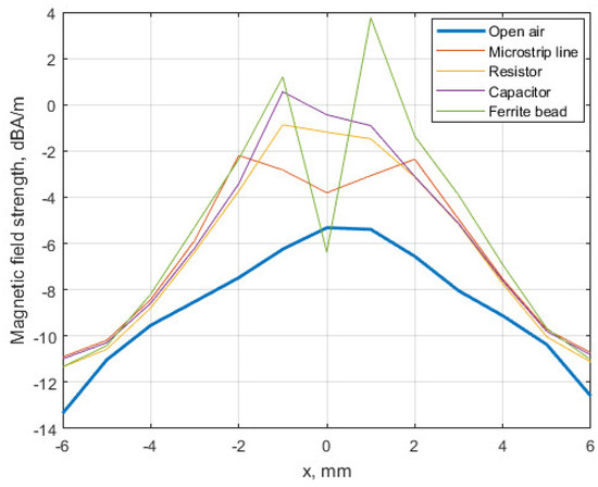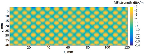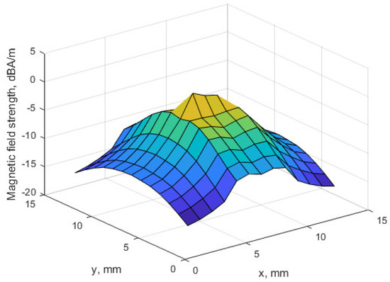 In the case of a 1 kΩ resistor displaced on the microstrip line abrupted trace, the MF map is presented in Figure 13. Lower coupling efficiency and therefore higher MF strength at the center of the component is observed.