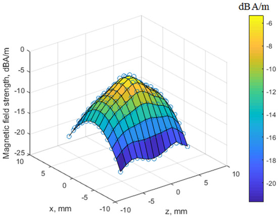 From the results presented in Figure 18, the absolute MF strength map at the surface of the PCB under the test with corrections applied according to the Table 5, can be used for the generation of the effective radiated field with minimum overlap criteria at −6 dB margin. The grid representation suitable for prescanning purposes was proposed and the map is shown in Figure 19.