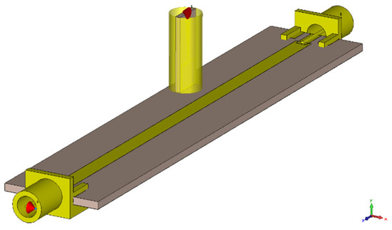 Some of the RF solutions that are subject and cause of the radiated susceptibility mapping hotspots are the PCB traces and polygons which may form RF filters, couplers, transmission lines, ground planes and vias. They do not exhibit magnetic properties when plated with solder paste or covered by a solder mask. The distortion of the near-field magnetic probe aperture correction map may appear due to local trace coupling, losses and reflections of the injected MF in the tracks and ground loops. Another group of objects is a variety of components which are used in the RF PCB boards including integrated circuits (IC) chips, resistors, capacitors, inductors, transformers, holders, etc. These components contain magnetic materials in their leads or in the body and therefore they tend to distort the MF injected by the probe. In this section, the distortion of MF distribution and influence to the near-field probe aperture geometry will be carried out. The simulation of microstrip line and three types of objects soldered on the microstrip line gap (resistor, capacitor and chip inductor, all of them of 0805 form factor) was performed. The model of the near-field probe at 5 mm distance for the microstrip line is shown in Figure 7.