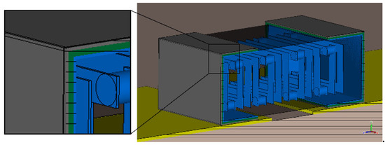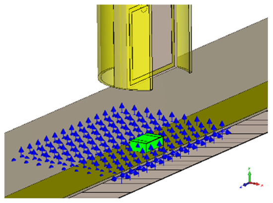 The microstrip line was implemented as a 50 Ω impedance trace formed on the top layer of the FR-4 laminate. Both input and output of the line were terminated with a broadband matched ports. The virtual array of absolute MF probes was positioned below the surface of the top copper layer in the model. The MF strength in the 0.1 mm depth under the copper trace of the microstrip line was measured. The displacement of the grid and the highlighted generalized component geometry are presented in Figure 8.