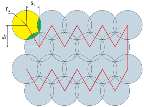 The probe aperture diameter was approximated by a circle using the maximum 5.3 mm diameter of the −6 dB probe aperture. The radiated susceptibility map scanning path strategy is shown in Figure 18.