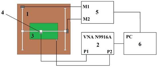 Radiated susceptibility mapping experimental system. 1—xyz scanner, 2—VNA FieldFox N9916A, 3—device under test, 4—magnetic near-field probe, 5—stepper motor controller, 6—computer.