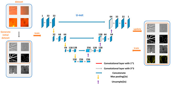 The aim of the semi-supervised learning method proposed in this paper is to obtain the satisfactory blood vessel tree by using a small amount of labeled data. In practice, we can obtain a large amount of unlabeled retinal images easily. In order to make full use of these images, we implement a dataset updating strategy, as shown in Figure 1. The dataset updating strategy aims to mark the unlabeled images automatically, and increase the number of the labeled images, which is helpful for estimating the network parameters. The specific implementation process is as follows.