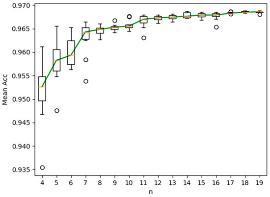 For easy observation, the box plot of the experiment results obtained by the proposed semi-supervised method is shown in Figure 3. As shown in Figure 3, the characteristics of the experimental results distribution can be observed from the box plot. From top to bottom, the observed statistical characteristics included upper extreme, upper quartile, median, lower quartile and lower extreme. In Figure 3, the Y-axis was the accuracy (ACC) and the X-axis was the number of labeled images (n = 4:19). The circular sign represented outliers and the red line represented the median. The green curve represented the curve of ACC with the number of labeled images.