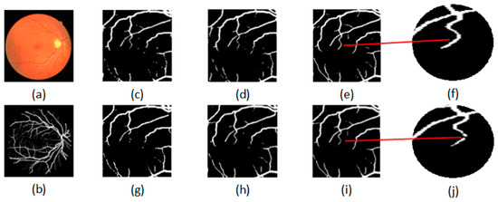 To further evaluate the proposed semi-supervised method, Figure 4 shows the qualitative performance comparison between the semi-supervised and the supervised method. The original fundus image is shown in Figure 4a and its ground truth is shown in Figure 4b. The segmentation results of the proposed semi-supervised methods by using 8, 12 and 15 labeled images are shown in Figure 4c–e, and the segmentation results of the supervised methods by using 8, 12 and 15 labeled images are shown in Figure 4g–i. For convenient observation, the local enlarged segmentation maps obtained by the proposed semi-supervised and supervised methods are shown in Figure 4f,j. From Figure 4f,j, we can see that the proposed semi-supervised method can obtain the complete retinal blood vessel tree, and the supervised method cannot obtain the complete retinal blood vessel tree. Therefore, we can conclude that the proposed semi-supervised method can achieve satisfactory segmentation performance.