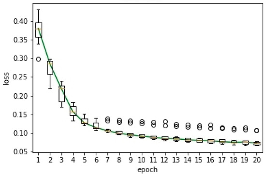 This experiment aims to verify the convergence of the proposed semi-supervised method. In this experiment, we carried out ten experiments. Based on the results of these ten experiments, we drew the box plot of the loss curve with time for the proposed semi-supervised method, as shown in Figure 5. The box plot was used to reflect the statistical characteristics of the loss curve. In the figure, the Y-axis was the loss and the X-axis was the number of epochs. Similar to Figure 3, the circular sign represented outliers and the red line represented the median. The green curve represented the loss curve with time. From the figure, we can observe: (1) With the increase of the epoch, the loss of the proposed semi-supervised method decayed rapidly. (2) When the number of epochs was more than ten, the change of loss curve tended to be stable. This verified the convergence of the proposed semi-supervised segmentation method.