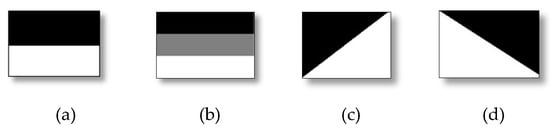 The predefined template which reflects to the symmetric structure, represents a 2D rough structure of a 3D scene geometry [5]. The template is defined as follows: a template T, has the same size as the input image I. It is composed of S segments . Element , if pixel belongs to the segment , e.g., in Figure 2a,c,d, the templates have two components () and templates in Figure 2b,g,h have three components (). Template (f) indicates the whole image as a one segment.