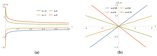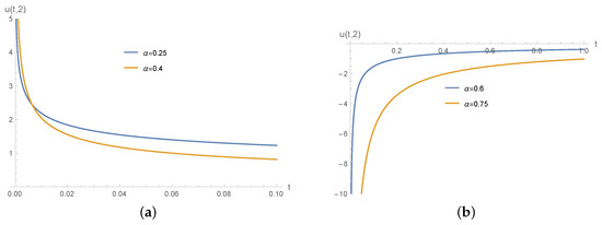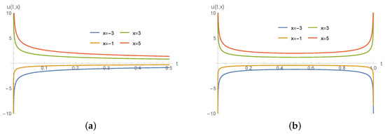 Solutions (65) and (67) are separable regular solutions, which are dispersive as . In both of these two solutions, is unbounded as . Interestingly, solution (67) has a blow-up for with . In view of the relation between and in (65) and (67), we only sketch the behaviors of in Figure 1, Figure 2 and Figure 3.