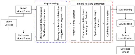 In this proposed model, the hybrid smoke segmentation combines moving foreground detection and smoke object segmentation. Block segmentation-based dynamic smoke growth analysis for smoke feature extraction, along with the spatial frame energy, is proposed here. Finally, an SVM algorithm is used to classify moving objects, which here is smoke. The proposed approach focused on the growth area of the smoke and characteristics features of smoke growth against time for classifying smoke and non-smoke objects. A flowchart of the proposed smoke detecting method appears in Figure 1 and is further discussed in the following subsections in greater detail.