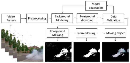 Many methods exist for the detection of smoke in the computer image processing sector. However, most of them experimented by combining several methods to improve performance and reliability. Most methods are similar to conventional smoke detection approaches. They include motion detection, a region of particle analysis, smoke volume energy [3,4,5]. Growth rate analysis from the dynamic volume of an increased number of smoke pixel has a great impact on detecting smoke. The differences in the efficacy of those algorithms are observed in different stages. All of the methods and techniques mainly consist of three steps: the preprocessing step; the smoke feature extraction step; and the smoke identification step.