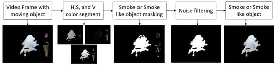 Figure 2 presents the overall process of GMM foreground moving object subtraction. The GMM method effectively separates the moving object; however, non-smoke objects might present inside the frame. With this, smoke or smoke-like objects need to be separated using color segmentation.