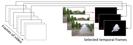 In the following step, temporal frame selection has been done to trade-off the image processing computational overhead and enough smoke growth for detection. To select the temporal frames, two frames per second and four selected frames are considered for analyzing the smoke growth.