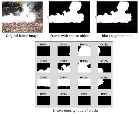 In the segmented blocks, the smoke or smoke-like objects are represented using an image component with the non-zero-pixel value. Consequently, the smoke density ratio (Di) of non-zero elements is calculated of each (i-th) segmented block. The density of the non-zero element in a frame is calculated as (total number of non-zero pixels (ni)/ total number of pixels of i-th block (Ni)) and multiplied by 100. Figure 5 presents the FBS process, SBs, and smoke density ratio (Di) of the blocks.