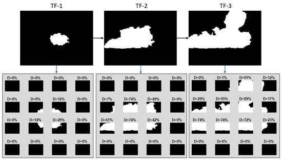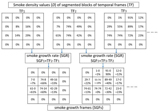 To analyze the smoke growth, a segmented smoke block of consequence temporal selected frames is compared. In this process, the temporal selected frames (TFj) are segmented using the FBS process. The smoke density ratio (Di) is calculated for each block of each frame. Figure 6 presents the smoke density ratio in each block of each temporal frame. Finally, the smoke growth rates (SGR) of smoke growth frames (SGF) are calculated by differencing the Di of corresponding SB of consequence in 2 frames. At the end of this growth analysis, SGFs are generated according to equation (7), where TFjDi is smoke density ratio of i-th segmented block of j-th temporal frame. Figure 7 illustrates the process of calculation of smoke growth rate, where TF1, TF2, TF3 are selected temporal frames and SGF1 and SGF2 are smoke growth frames.