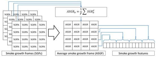 During the temporal consequence of smoke growth, the ratio of smoke growth of different segmented blocks varies. Moreover, some stationary and static movement smoke-like objects have distinguishable growth patterns compared with the smoke object. The localization of smoke growth within the segmentation block and its patterns is potential information for detecting smoke. The smoke growth rate (SGR) of the different segmented blocks is therefore considered for extracting features. In this feature extraction process, the SGR values of blocks of SGFs are averaged and construct the average smoke growth frame (ASGF). Finally, the block values of ASGF are organized into a feature vector. Figure 8 represents the process of the smoke growth feature extraction.