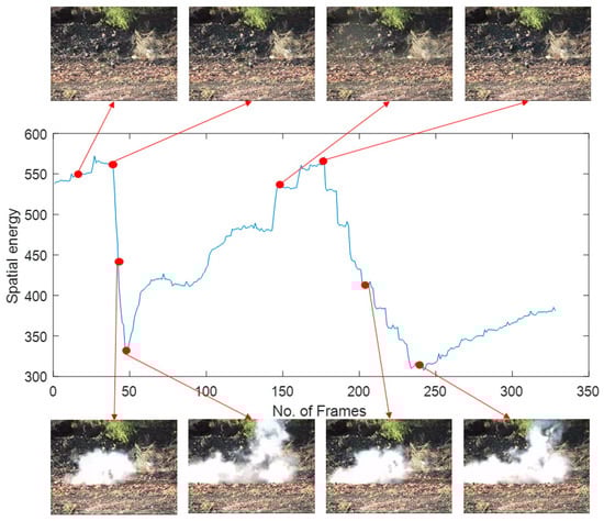 Spatial energies of temporal frames with non-smoke and smoke moving object.