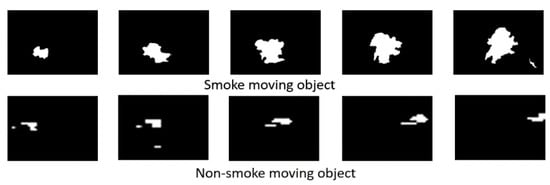 In this proposed model, the video frames are initially preprocessed and remove the background for detecting the moving foreground object. The GMM-based moving object detector detects the moving foreground efficiently, which extracts all moving objects in the frame. Because moving smoke is the main concern of this detecting process, the filtered frames with moving objects are further processed for recognizing only smoke objects using HSV color segmentation. The preprocessing step segments the smoke or smoke-like object of the frame for further analysis. Figure 12 shows some preprocessed frames with smoke and non-smoke objects.