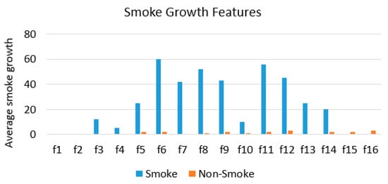 After getting the Di, the smoke growth rate (SGR) is calculated by differencing the Di of the corresponding segmented block of consequence (two frames) and constructs the smoke growth frame (SGF). At the end of this growth analysis, three SGFs are generated, where SGF1 = TF2 − TF1, SGF2 = TF3 − TF2, and SGF3 = TF4 − TF3. At the end of the smoke growth calculation, the 16 ASGFs are calculated for each block from all selected temporal frames to extract features. The ASGF values of the density block are serialized in vector to generate smoke growth features vector. Figure 14 presents non-smoke and smoke growth feature vectors.