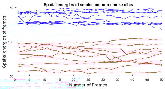 Spatial energies of frames with non-smoke and smoke clips, where the color red presents the energy of frames with some and the color blue presents otherwise.