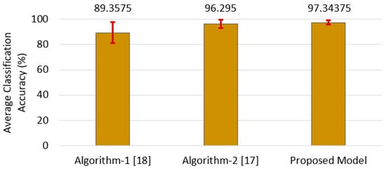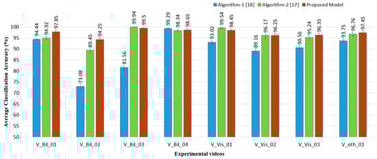 Figure 16 presents the average CA of different videos of the proposed model and state-of-the-art algorithms. In Algorithm-1 [18], the author presented an efficient spatial-temporal analysis-based smoke detection model. In this approach, the smoke region of the video frame is segmented using HSV color analysis only, which, on occasion, shows a false smoke region for the complex and dynamic movement background. In our proposed model, this challenge is addressed by adaptive moving object detection and the color segmentation-based smoke region detection process. In paper [18], spatial-temporal smoke analysis is applied, which has proven to be effective. Conversely, histograms of oriented gradients and optical flow (HOGHOF) descriptors for smoke motion modeling are sub-optimal for a smoke-like moving object. In V_Bil_02, there is a background light and V_Bil_03 has very thin smoke. Thus, the performance of Algorithm-1 shows very low classification accuracy, which degrades the overall performance. In Algorithm-2 [17], the author presented a smoke flow pattern for smoke detection. By contrast, only color segmentation is used for smoke segmentation in this paper. The smoke flow pattern is detected by a multi-angle orientation-based Gabor filter applied to the temporal differenced frame. Furthermore, the statistical parameter is extracted as features. Temporal differenced smoke edges extracted by the Gabor filter indicate good performance in many cases. In the case of extremely dynamic moving smoke, however, our proposed model outperforms this model. During the experiment, the performances of the state-of-art model for video V_Bil_02 (Bilkent/sEmptyR) is below average because of static smoke-color light. Even so, the proposed model shows better performance. In the video V_Bil_03 (Bilkent/sParkingLot) the smoke transparency is extremely high, which affects the classification performance. Figure 17 provides the average classification accuracy for the proposed model as well as the state-of-the-art algorithms.