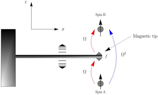 Wave-particle duality is a fundamental principle of quantum mechanics postulating that even macroscopic objects have wave features. However, the manifestation of quantum behavior is inversely proportional to the mass of the particle , where is the de Broglie wavelength, m and v are the mass and velocity of the particle, and ℏ is the Planck constant. Hence, mechanical motion, in general, should be viewed as classical unless the system is not cooled down to the temperature below . For example, for mode frequency kHz, the temperature should be lower than nK. Fortunately, the resonant frequency scales inversely with the size of the system. Thus, by considering nanosized cantilevers and cooling the systems to low temperature, mechanical motion switches its character and crosses the threshold boundary between the classical and quantum world. The viable technological progress of the last two decades allowed the fabrication of hybrid spin nanomechanical systems. Nanoelectromechanical resonators (NAMR) are essential for both the understanding of fundamental questions and technological applications as well. The paradigmatic model of NAMR consists of the spin of the NV center interacting with a magnetic tip. The magnetic tip is attached to the end of the nano-cantilever (i.e., cavity field). The oscillation of the cantilever modulates the spin-tip interaction and activates the spin dynamics or vice versa; the highly sensitive cantilever can detect the spin dynamics. The magnetic force between a ferromagnetic tip and NV spin implemented in magnetic resonance imaging experiments allows achieving a single-spin sensitivity and is an essential experimental scheme for NAMR [,].