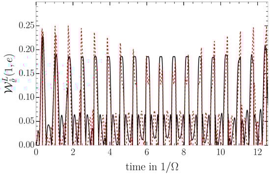 A plot of the quantum witness is presented in Figure 2. From Figure 2, we see that the saddle-point method smears out slow modulation of the amplitude of the quantum witness that we observe in the exact solution. The modulation of the witness strength amplitude is inherently a quantum effect related to the entanglement between the cavity field and NV centers. The saddle-point, which is valid for , partially eliminates the entanglement effect. The witness is finite, but smaller than the maximum witness observed for the entangled states. The limit for the first term in Equation (12) leads to a fast oscillation between zero and , while the second term results in . In this case, the resonant Equation (12) and non-resonant Equation (13) results are of the same order.