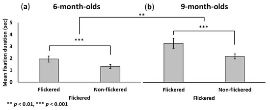 For the same-attractiveness pair, results revealed that both 6- and 9-month-olds looked longer at the face with flickered outline (flickered: M = 2.54 s (SD = 1.15) vs. non-flickered: M = 1.71 s (SD = 0.68); F(1, 15) = 31.63, p < 0.001, ηp2 = 0.68; see Figure 2), which suggests that bottom-up attention through the flickered stimuli attracted infants’ gaze and affected the fixation duration. We also found a significant main effect of month such that 9-month-olds looked longer at faces than 6-month-olds (6-month-olds: M = 1.63 s (SD = 0.70) vs. 9-month-olds: M = 2.67 s (SD = 1.06); F(1, 15) = 14.34, p = 0.002, ηp2 = 0.49), but there were no significant interactions.