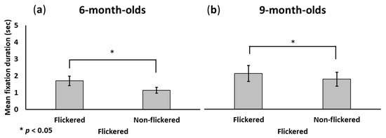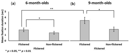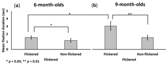 For the different-attractiveness pairs, results revealed that both 6- and 9-month-olds looked longer at the face with flickered outline (flickered: M = 2.64 s (SD = 1.47) vs. non-flickered: M = 1.65 s (SD = 0.95); F(1, 14) = 16.05, p = 0.001, ηp2 = 0.53; see Figure 3), suggesting that bottom-up attention by flickered stimuli attracted infants’ gaze and affected the fixation duration even though the attractiveness differed between the presented faces. We also found a significant main effect of month such that 9-month-olds looked longer at faces than 6-month-olds (6-month-olds: M = 1.62 s (SD = 0.86) vs. 9-month-olds: M = 1.51 s (SD = 1.51); F(1, 14) = 10.47, p = 0.006, ηp2 = 0.47), and marginally significant interactions between month and flicker (F(1, 14) = 3.85, p = 0.070, ηp2 = 0.22). A simple main effect test revealed that both 6- and 9-month-olds looked longer at flickered stimuli than non-flickered stimuli (6-month: flickered M = 1.87 s (SD = 0.92) vs. non-flickered M = 1.36 s (SD = 0.74), F(1, 7) = 5.79, p = 0.047, ηp2 = 0.45; 9-month: flickered M = 3.42 s (SD = 1.54) vs. non-flickered M = 1.93 s (SD = 1.08), F(1, 7) = 8.34, p = 0.023, ηp2 = 0.54) but the fixation duration in 9-month-olds was longer than in 6-month-olds for flickered stimuli (6-month-olds: M = 1.87 s (SD = 0.92) vs. 9-month-olds: M = 3.42 s (SD = 1.54); F(1, 14) = 11.27, p = 0.005, ηp2 = 0.45).