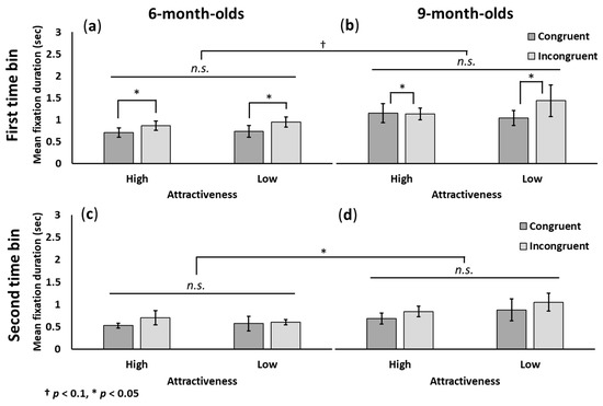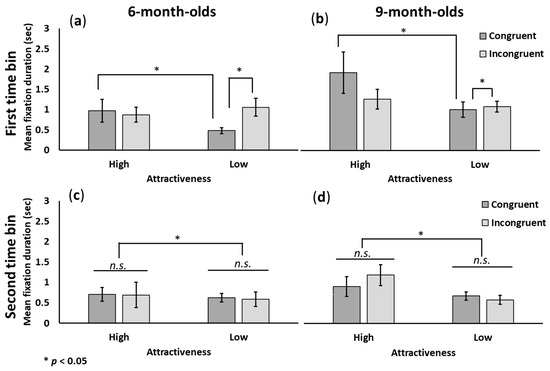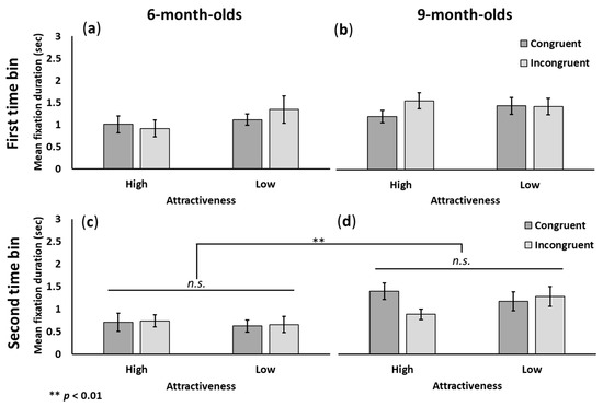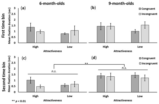 Mean fixation durations (s) for the preference looking to the same-attractiveness pairs in Experiment 1. Panels (a,c) show the data for 6-month-olds and (b,d) for 9-month-olds. The upper two panels show the fixation durations in the first time bin and the bottom two for the second time bin. Congruent means the fixation duration to the same face at the same position as the face with flickered outline in the movie stimuli. The error bars indicate standard errors.