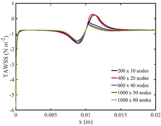 We use successively denser grids and we examine the convergence of both stream function and vorticity field. Additionally, we examine the convergence of derived quantities, such as time average wall shear stress (TAWSS), which involves computation of spatial derivatives of the unknown field functions. We use five grid configurations, starting with a coarse grid with spatial resolution ( uniform grid with 2000 nodes in total), and a denser grid with resolution ( uniform grid and 128,000 nodes). Figure 1 shows the TAWSS for all grid configurations used. The difference for the two finest grids is less than 1%, indicating that the resolution higher than ensures a grid independent numerical solution.
