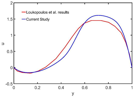 We demonstrate the accuracy of the meshless method, by comparing the numerical results obtained with those reported in Loukopoulos and Tzirtzilakis [15], using the finite difference (FD) method. Figure 2 shows the velocity profile at computed using the MPC and the FD method [15].