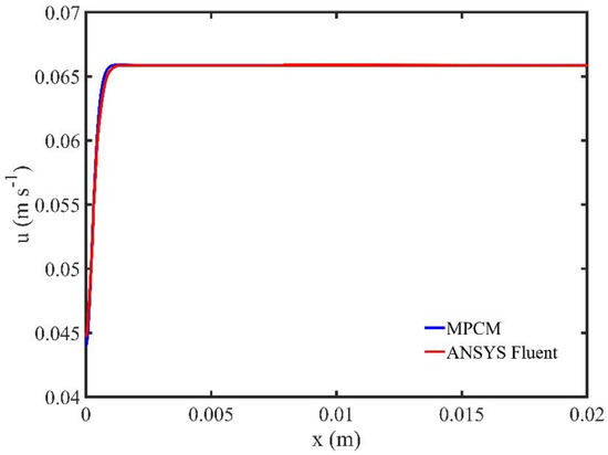 We also highlight the accuracy of our meshless scheme by comparing our time accurate solutions with those computed using the commercial CFD software ANSYS FLUENT® (ANSYS Inc., Canonsburg, PA, USA) [44]. The flow domain is a rectangular channel of length and width . The fluid flow is incompressible, laminar, non-Newtonian (power-law model with (Equation (16)). The density is set to and the viscosity to . We apply a sinusoidal velocity at the inlet. We compare the centerline velocity of the two methods for different time instances and the difference (for all three velocity vector components) is less than . Figure 3 shows a comparison of the two methods at time .
