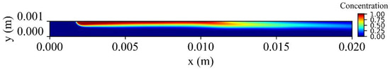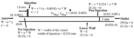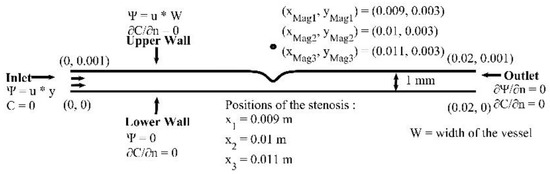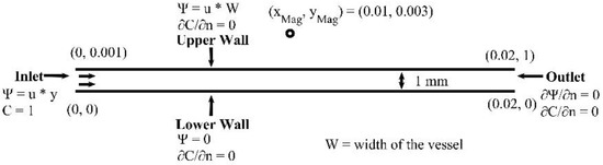 In this section, we study the biomagnetic flow in a planar microchannel. The flow domain and the boundary conditions are shown in Figure 5. The MNPs (drug carriers), enter the channel through the inlet. A detailed description of the concentration the boundary conditions is presented in [16,22]. We represent the spatial domain using 50,000 nodes, which ensure a grid independent numerical solution. We set the time step to s and the MNPs volume fraction at the inlet to φ = 0.03.