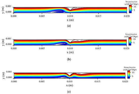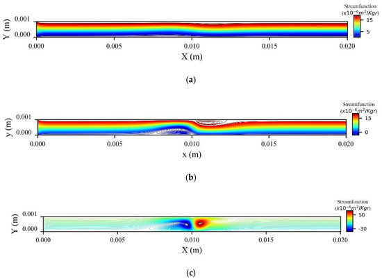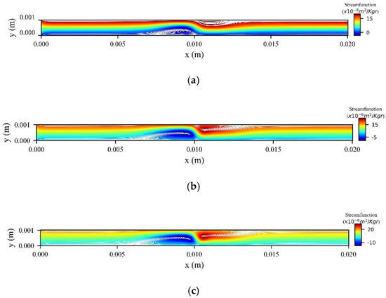 Stream function contours for (a) b = 0.003 m, (b) b = 0.002 m, and (c) b = 0.001 m at t = 0.8 s.