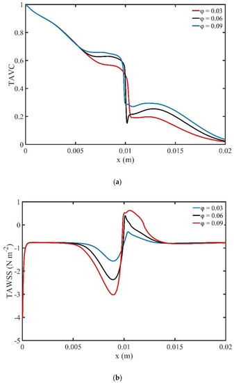 (a) Time average volume concentration (TAVC) and (b) Time average wall shear stress (TAWSS), along the upper wall for one period of cardiac cycle and various MNPs volume fractions φ.