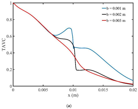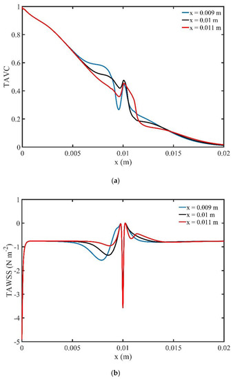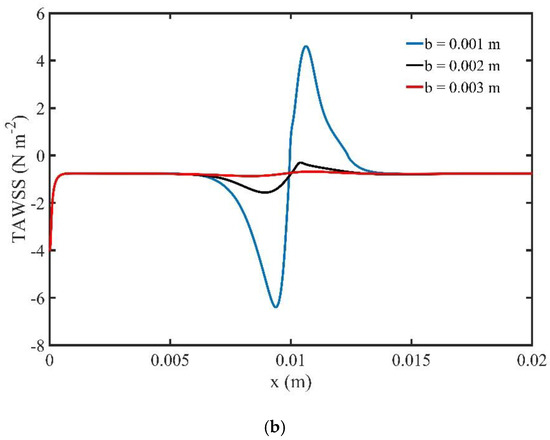The profile of the TAVC along the upper wall of microchannel is shown in Figure 9a, for three specific locations of the magnetic field source. It is observed that when the magnetic field source is located closed to the upper wall, , there is an increase of TAVC upstream of the magnetic field source. Similar behavior of the TAVC of MNPs is followed when the distance b is increased, and , and thus the influence of the magnetic field is decreased. Figure 9b shows the effect of the magnetic field location on TAWSS. We observe that when the magnetic source is far from the upper wall of the channel, , the effect of the magnetic field on the TAWSS is negligible. When the distance is decreased, the TAWSS increases closed to the magnetic source. The highest TAWSS values are observed when the distance b is minimum and equal to .